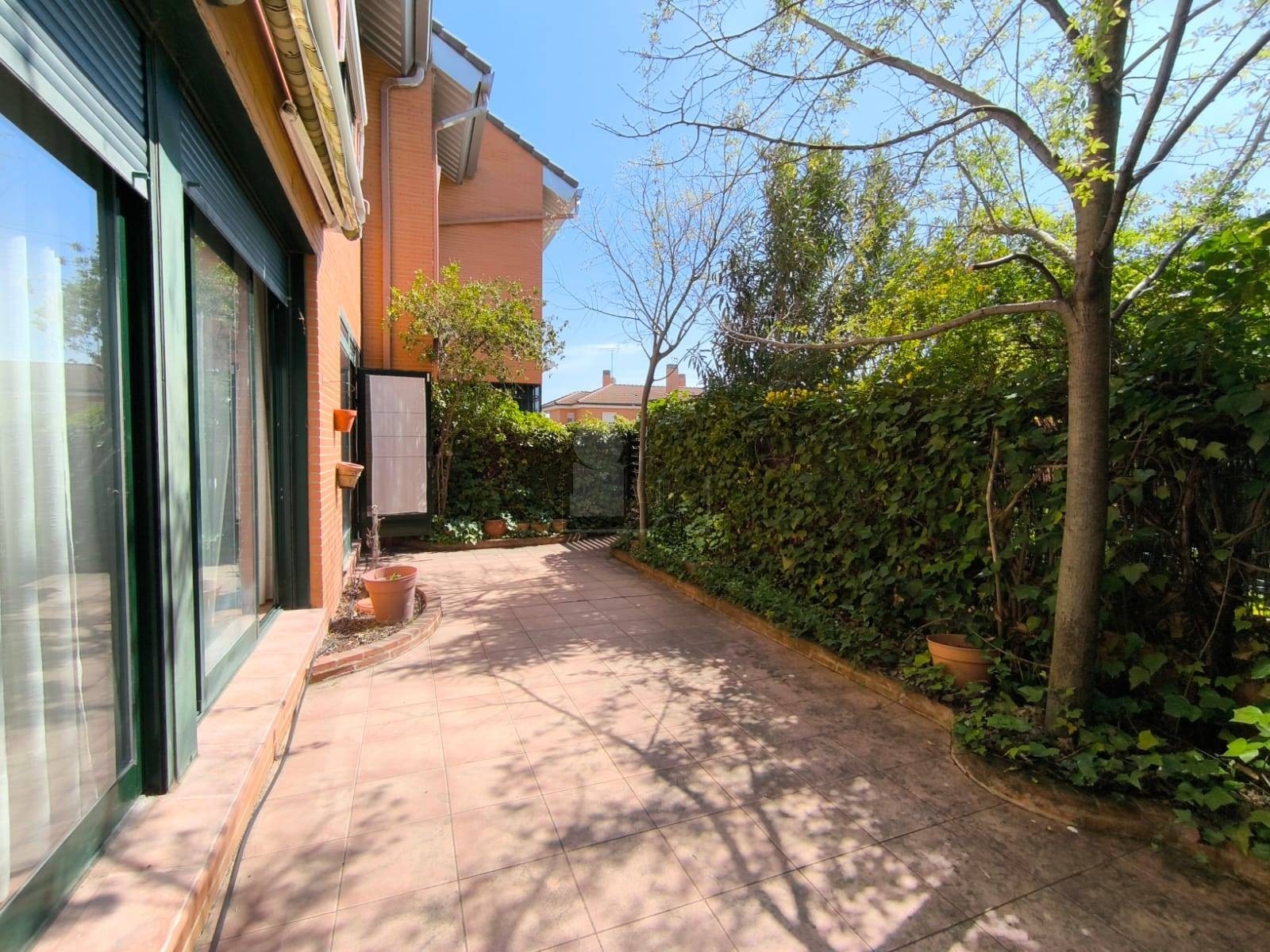 -ZONA EXTERIOR.- Tiene un porche delantero de 16 m2 de jardín con diverso arbolado, y otro trasero de 32 m2 con suelo de baldosa de gres rústico, que da acceso a la zona comunitaria privativa de solo 16 chalets, con jardín y piscina, NO TE PREOCUPARAS DE MANTENIMIENTO DE JARDIN y PISCINA.