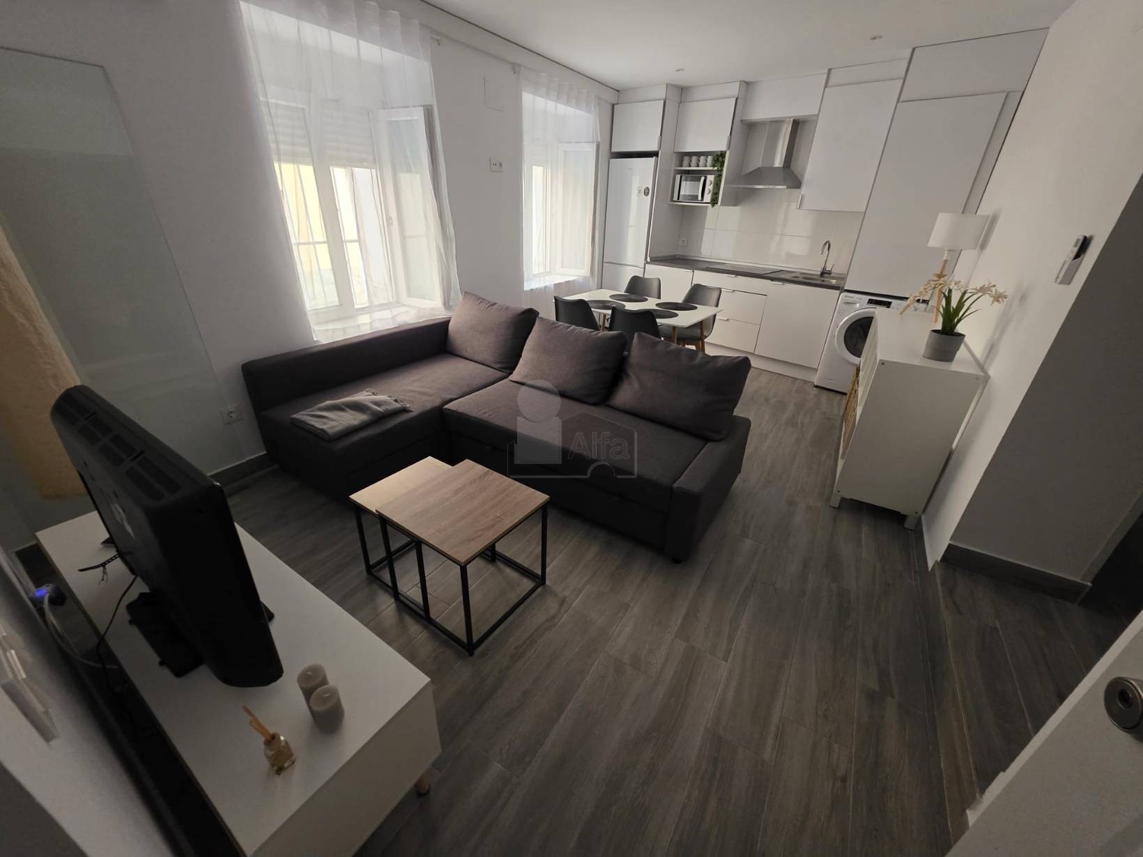 El apartamento presenta suelo de gres imitando tarima, puertas pintadas en color blanco y ventanas blancas con doble acristalamiento y sistema oscilobatiente, lo que garantiza un buen aislamiento térmico y acústico.